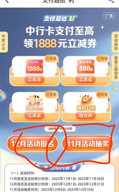 活动路径:中行APP-首页-热门活动-支付超给“利”-11月活动抽奖