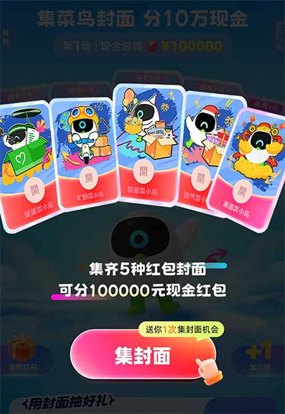 支付宝集菜鸟封面瓜分10万元现金红包,简单浏览任务抽