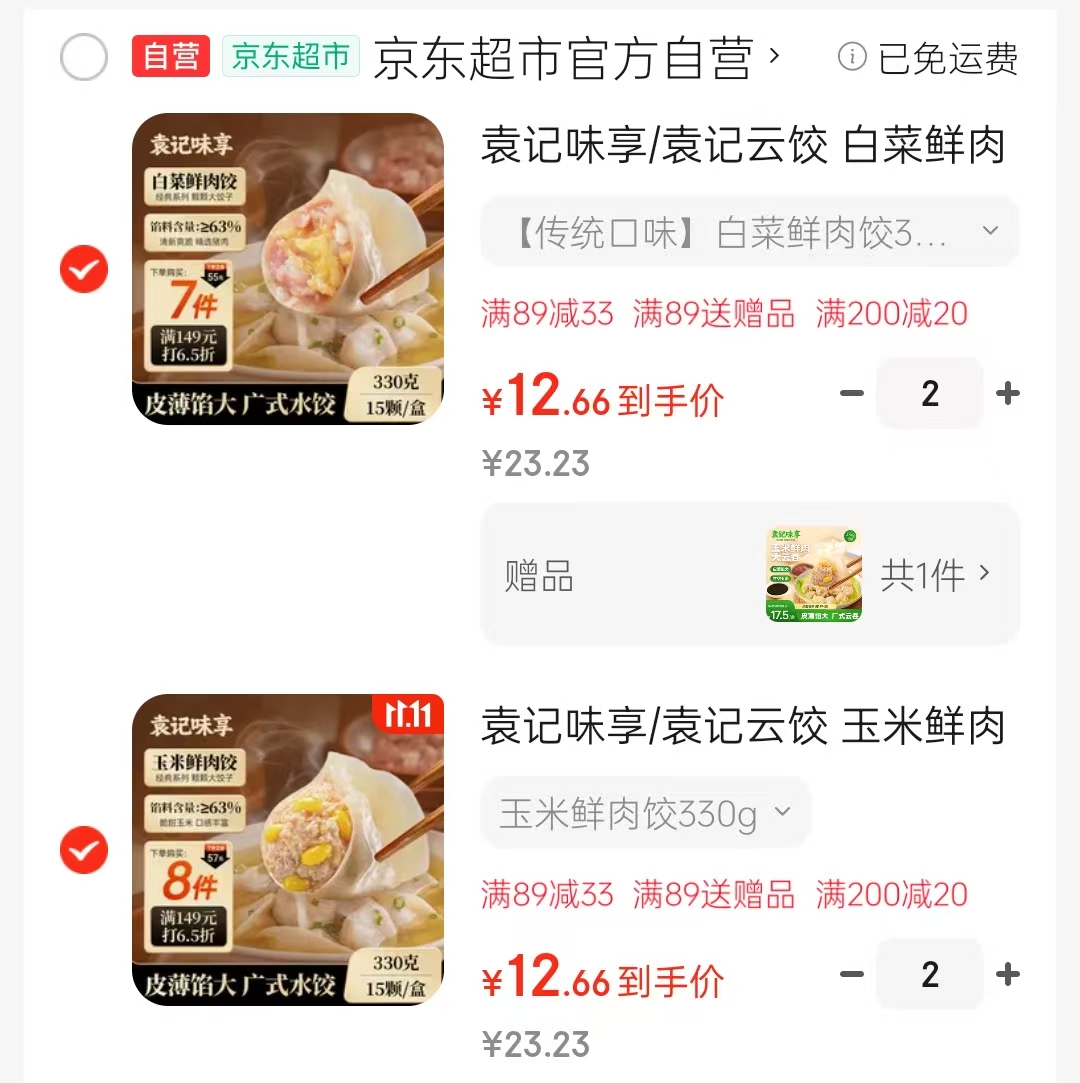 跳转APP主会场领200-20卷 自营 袁记味享 饺子合集 玉米鲜肉饺330g 白菜鲜肉饺330g